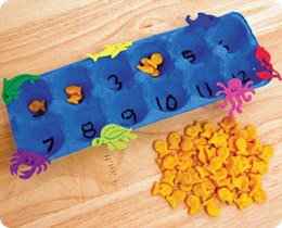 Para hacerlo solo necesitamos una huevera de cartón (según la capacidad así podréis trabajar los números). Para realizarlo solo debéis pintarla de color azul y luego decorarla con algunos animales marinos (si sois la clase de los peces o trabajáis los animales marinos se convierte en un excelente complemento para aprender en el rincón de la matemática).