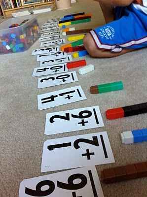 El procedimiento es sencillo. Los niños deben coger una de las tarjetas con sumas y realizar la operación pero en vez de escribir el resultado lo han de montar con piezas.De esta manera trasladamos el concepto abstracto de la suma a algo totalmente manipulativo como es el montaje de torres de piezas de colores, y así es más fácil para los niños llegar a comprender el mecanismo de las operaciones.