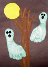 Estamparemos los pies de los peques sobre la hoja marrón o blanca (pintada por ellos antes). Los ojos y la boca están pintados o podemos hacerlos con gomets negros. El árbol es la mano, luego el tronco hay que pintarlo con pincel y pintura marrón, y finalmente ponemos el detalle de la luna en color amarillo suave, para no quitar protagonismo a los dos nuevos amiguetes.