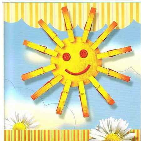 Mirad que bonito sol hemos preparado con un círculo de cartulina de color amarillo, unas pinzas pintadas de color amarillo y naranja, dos botones rojos y un poquito de plastilina para hacer de boca. ¿A qué es simpático? Pues quedará precioso en cualquier rincón de la clase decorándola y alegrándola.