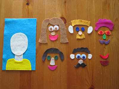 Trabajamos las partes de la cara (conocimiento de uno mismo, psicomotricidad): En esta actividad los niños han de ir colocando las partes de la cara que les vayamos indicando y según nuestras indicaciones (color de ojos, tamaño de nariz, longitud del cabello, direccionalidad de la boca, esto es, si es hacia arriba o hacia abajo, etc). De esta manera a la vez que trabajamos el conocimiento de su propio cuerpo, trabajamos varios conceptos matemáticos, resultando así, una actividad bastante completa.