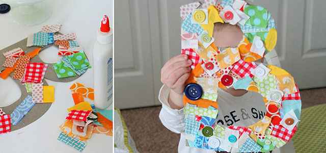 Esta sencilla actividad dirigida a los más pequeños es muy vistosa, y consiste en la realización de una plantilla en cartón o cartulina, a gran tamaño de su inicial. La maestra ha de prepararlas con antelación ya que son aún pequeños para recortarlas. A continuación les hemos de proporcionar retales de telas de diversos estampados, recortadas en forma cuadrada y rectangular, y botones de diversos tamaños y colores. Los niños deben pegar con cola los trocitos de tela en la plantilla hasta cubrirla y luego los botones para darle un toque más divertido.