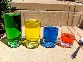 En primer lugar les pedimos a los niños que llenen los vasos con agua. Les explicamos que cada vaso debe tener una cantidad diferente, de más a menos. Podemos utilizar tantos vasos como colores de colorante tengamos a mano. Una vez llenos los vasos con diferentes cantidades cada uno de ellos, les pedimos que añadan unas gotas de colorante a cada uno. Después lo removerán para que con la cuchara para que el agua se tiña de color. Podemos pedirles que cuenten las gotas, así repasamos los números. Podemos hacerlo de dos maneras. La primera es dar un número concreto de gotas, y que ellos cuenten hasta que las completen. La segunda es dejar que ellos decidan las gotas que quieren poner según el color que quieran obtener, en cuyo caso igualmente deben contarlas.