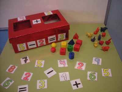La actividad es sencilla. El docente engancha con blue-tack en la parte superior de la caja un par de etiquetas con números y en medio de los agujeros el símbolo de la operación que vamos a realizar. Los niños deben introducir en la caja tantas piezas como indiquen los números en el caso de la suma, y debe introducir y extraer de igual manera si es una resta.