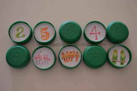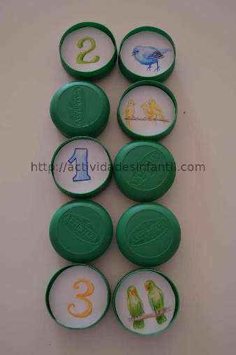 Otra propuesta es que dais a los niños los tapones con los números y ellos han de ir buscando el que tiene la cantidad de pájaros correcta (teniendo a la vista todos los tapones).