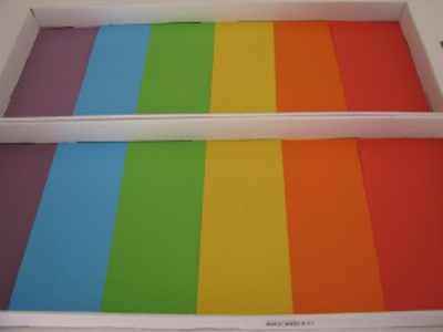 Para preparar la caja del arcoiris necesitamos una caja de cartón grande que no sea muy profunda, podemos utilizar la tapa, papeles de los colores del arcoiris, tijeras, cola y sal. Lo que debemos hacer es cortar tiras iguales con los papeles de colores hasta que tengamos siete tiras que serán las que formen nuestro «arcoiris».Una vez las tenemos, las ordenamos y las pegamos en el fondo de la caja.