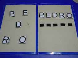 Por otra parte prepararemos unas etiquetas con las letras y también les pondremos un trocito de velcro detrás; no sin antes haberlas plastificado también para que se mantengan bien durante más tiempo. Lo que tenemos que hacer a continuación es poner el nombre del alumno o alumna con quien queramos trabajar este aspecto, y en el otro lado ponemos su nombre con las letras desordenadas. Lo que han de hacer los niños es, observando el modelo dado colocar correctamente las letras debajo de las que nosotros les hemos facilitado.