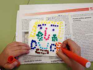 La simetría es un concepto matemático que tiene una cierta dificultad para ser comprendida por los niños, así que lo mejor es experimentar con ella y trabajarla de diferentes maneras. Una de estas maneras es realizar dibujos plásticos, estampaciones, etc, que nos muestre de manera directa el efecto que producimos al hacer algo simétrico. En esta ocasión, para trabajar la simetría con los peques, decidimos hacer unas bonitas mandalas en las que además del efecto decorativo facilitara un aprendizaje del concepto en sí, y para ello preparamos papeles de cocina, rotuladores gruesos, tijeras para recortarlas y darle una forma circular, y no podemos olvidar un poquito de papel de diario viejo para proteger las mesas de manchas no deseadas.