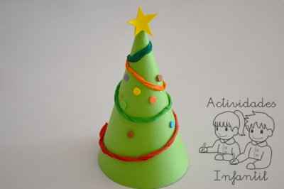 En primer lugar, haremos un cono con la hoja de papel sobre el que pegaréis con un poco de cola los elementos que hayáis elegido. Podéis hacer el árbol de los círculos (círculos de goma eva de diversos tamaños y colores), el de los triángulos (de la misma manera con goma eva), el árbol brillante (con cuentas brillantes), el de las letras (decorad unas letras y las pegáis en él, en este caso podéis poner un mensaje navideño), podéis pegar arroz de colores, etc, cualquier idea que se os ocurra será estupenda y os quedará un trabajo muy bonito. Eso sí, todos sin excepción deberán estar coronados por la Estrella de Navidad (sino no sería navideño), la cual también os la dejo a vuestra elección.