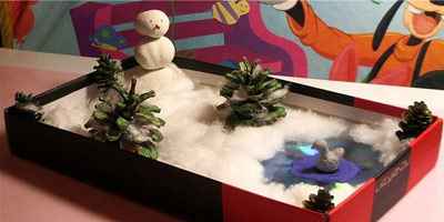 Hace mucho frío y como nos gusta mucho jugar con la nieve hemos preparado un bonito paisaje nevado aprovechando cosas que ya no nos sirven, para que nos lo llevemos a casa y podamos jugar con nuestro «amigo» el muñeco de nieve e inventarnos historias fantásticas y frioleras.