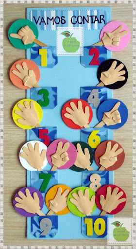 Un bonito mural realizado con fieltro, para aprender los números del uno al diez. Para hacerlo, debemos pegar diez trozos de fieltro a modo de bolsillos con el número también colocados sobre ellos, sobre un fondo de fieltro.