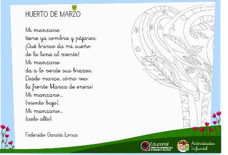 Os dejamos una bonita ficha con un poema de Federico García Lorca, con el que podéis trabajar el mes de Marzo con los peques.