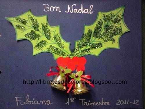 Tapa para el álbum de Navidad. Campanitas de acebo. Desde Libretas de Colores os presentamos esta portada tan vistosa. Sobre un fondo de color azul oscuro, se ha enganchado un papel verde recortado previamente con la silueta de la típica planta de Navidad. Después se ha decorado con un poco de purpurina de color verde.